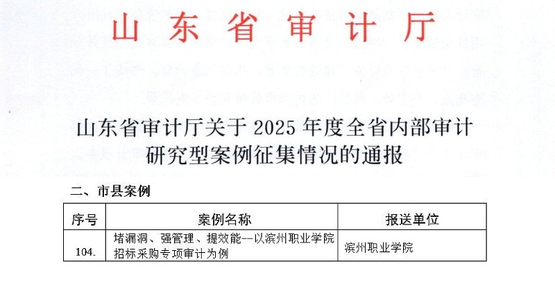 近日,山东省审计厅发布《关于2025年度全省内部审计研究型案例征集情况的通报》,滨州职业学院审计处报送的案例,成功入选2025年度全省优秀内部审计研究型案例,并被纳入全省内部审计实务攻关成果案例库。