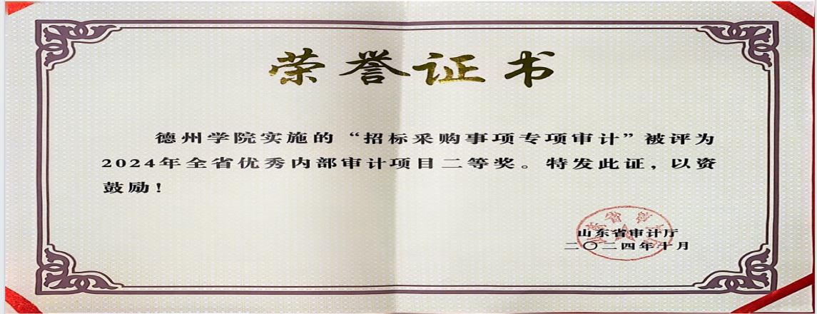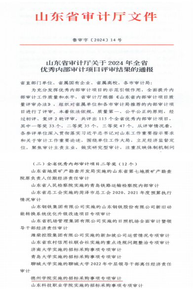 10月中旬,德州学院审计处报送的《招标采购事项专项审计》项目,在山东省审计厅举办的全省优秀内部审计项目评审中荣获“全省优秀内部审计项目二等奖”。全省共评出115个优秀内部审计项目,其中高校项目占一等奖2个,二等奖5个,三等奖6个。