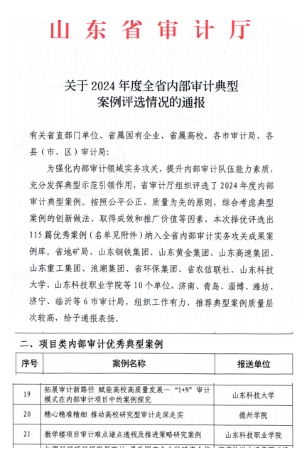 近日,德州学院审计处报送的审计案例《精心精准精细 推动高校研究型审计走深走实》,在山东省审计厅举办的2024年度全省内部审计典型案例评选中,被评为“项目类内部审计优秀典型案例”。全省共有115篇案例入选,其中,“管理类内部审计优秀典型案例”59篇、“项目类内部审计优秀典型案例”56篇。全省高校仅有3篇案例入选“项目类内部审计优秀典型案例”。