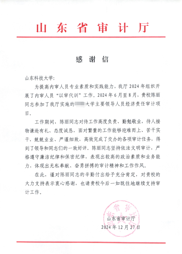 山东省审计厅2024年组织开展了内审人员“以审代训”工作,6月至8月,山东科技大学审计处陈丽同志参加了山东省审计厅实施的某高校主要领导人员经济责任审计项目。12月27日,山东省审计厅向学校发来感谢信,感谢学校对审计厅工作的大力支持,对陈丽同志的辛勤付出给予充分肯定。