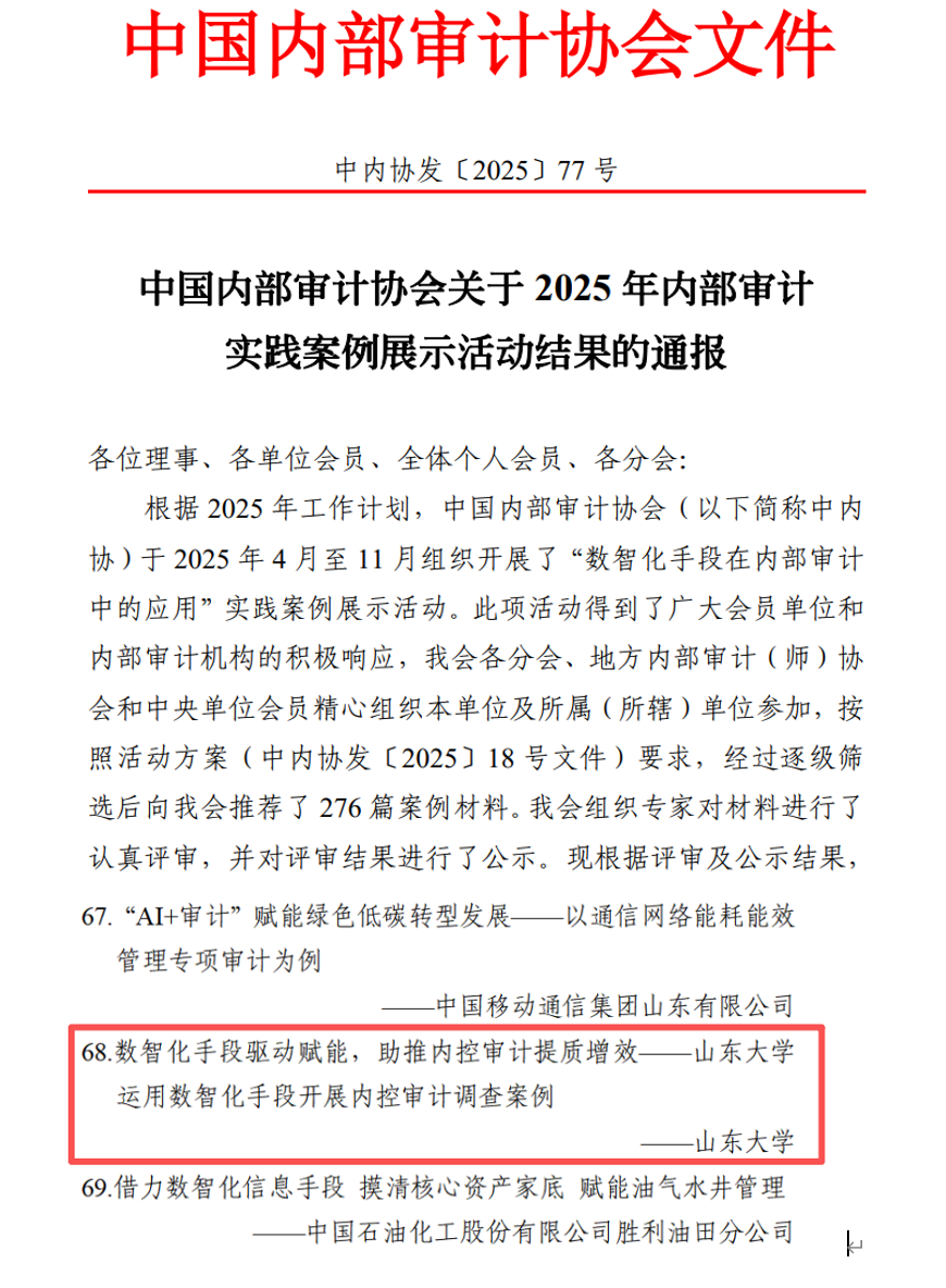 近日,中国内部审计协会通报了“数智化手段在内部审计中的应用”典型实践案例评审结果。山东大学报送的案例《数智化手段驱动赋能,助推内控审计提质增效——山东大学运用数智化手段开展内控审计调查案例》获评“典型实践案例”。